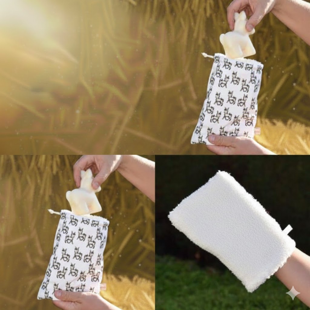Ce gant toilette molletonné avec dessin âne, peut être utilisé comme sac de voyage pour transporter votre petit savon âne